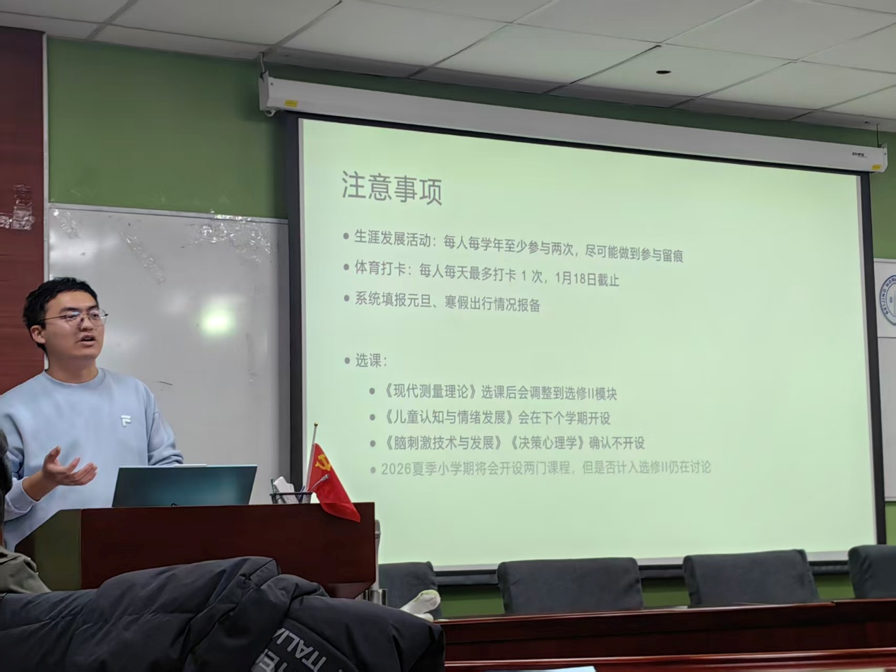 2025年12月21日晚上7点,2023级本科励耘班秋季第四次班会顺利举行。班会由班长詹皓钧主持,于后主楼1420进行。