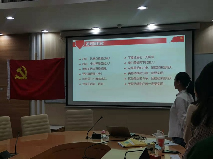 首先,全体参会人员面向党旗起立,齐唱《国际歌》。随后,支部书记廖晨曦介绍转正流程。