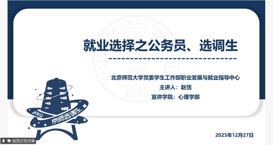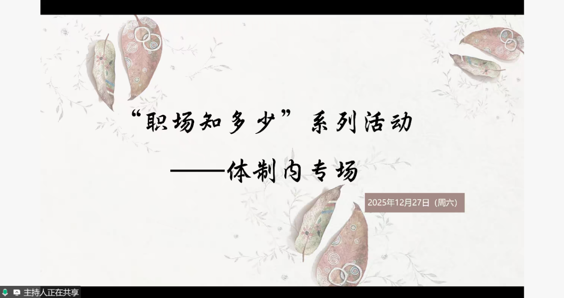 2025年12月27日下午,“职场知多少”系列活动——体制内专场分享会于线上腾讯会议顺利举办。活动由我校星辰宣讲团赵恬同学、体育博彩网站 往届毕业生李言师姐、张雨辰师姐共同主讲,吸引了近50名学子在线参与。分享会聚焦公务员、事业单位等体制内职业方向,通过政策解读、经验分享与互动答疑,助力学子把握招考要点、明晰职业路径,为未来就业选择提供务实指导。