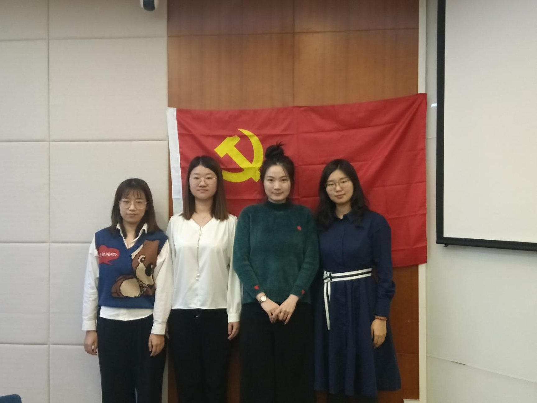 最后四名发展对象在党旗前合影纪念,体育博彩网站 研究生第十一党支部本学期第一次党员发展大会圆满结束。