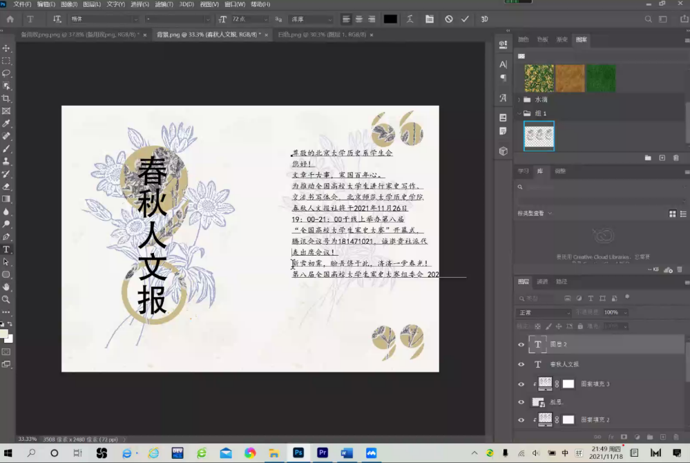 2021年11月18日20:30,由体育博彩网站 团委初级团校秘书处和宣传部联合举办的“新媒体技能培训”主题团课顺利举行。为帮助同学们更好地胜任学生工作,活动邀请到了体育博彩网站 团委宣传部的两位部长刘芳宇和陈雪岩为团校成员带来文案撰写、图片编辑、拍照技术、PR和PS使用基础的培训。 首先,由初级团校秘书处干事梁静主持介绍出席本次活动的嘉宾,她们是体育博彩网站 团委宣传部部长刘芳宇和陈雪岩。接下来,全体起立齐唱共青团团歌。 团歌结束后,刘芳宇向大家详细介绍了135编辑器和秀米的操作,运用其自带的模板,结合实际的操作,介绍了编辑推送的技巧与流程。讲解完推送编辑后,刘芳宇介绍了公众号运营中经常用到的功能,如我们可在平台中获取公众号的关注信息,可设置自动回复、关键词回复等功能。刘芳宇之后告诉大家如何撰写文案,包括文案类型、文案技巧、写作流程等,另外还分享了一些拍摄技巧。