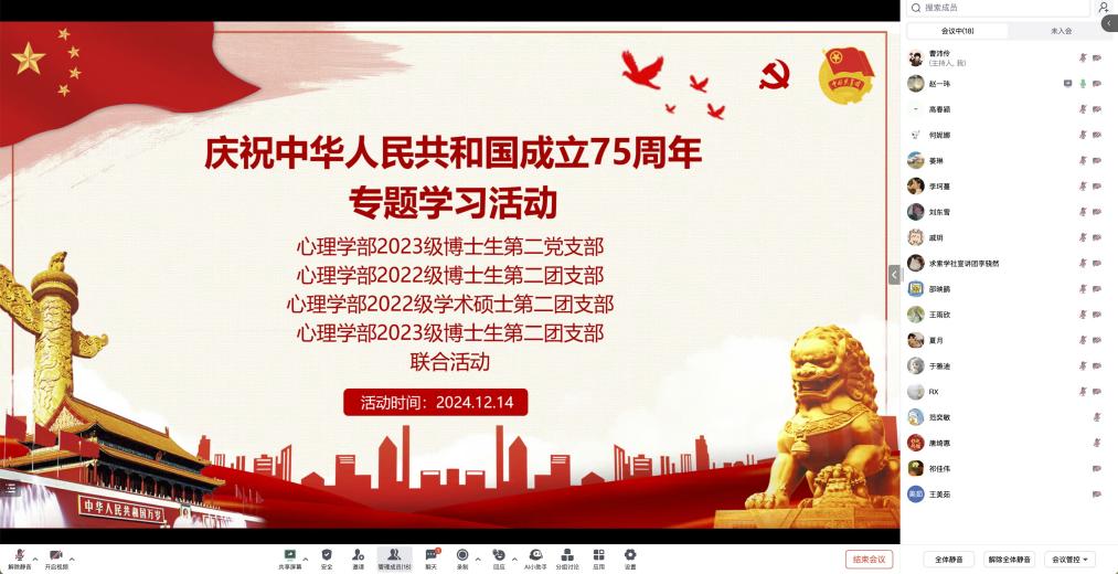 2024年12月14日晚八点,体育博彩网站 2023级博士第二党支部、2022级博士生第二团支部、2023级博士生第二团支部及2022级学硕第二团支部于线上腾讯会议联合开展“庆祝中华人民共和国成立75周年”专题学习及主题团日活动,回顾祖国的奋斗历史和辉煌历程,学习新时代新思想。本次学习共有16位党员和预备党员以及7位团员参加。