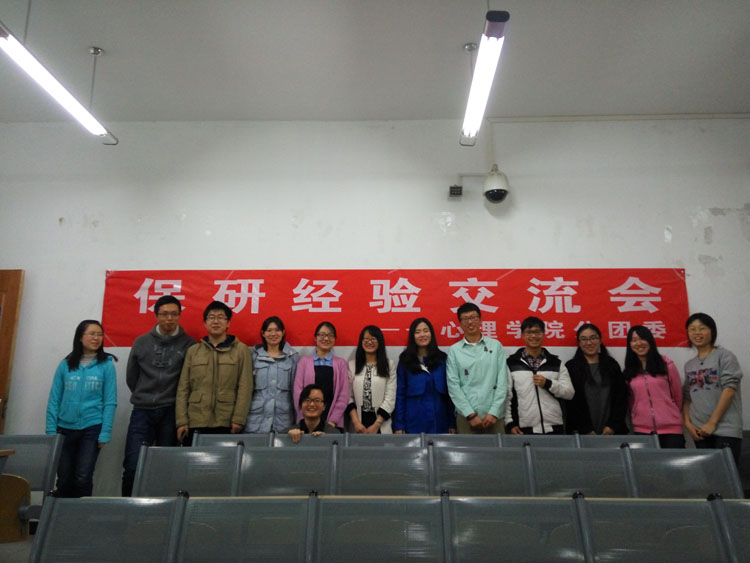 2016年3月27日晚,由心理学院2013级班委及心理学院分团委学习交流部合作主办的心理学院保研经验交流会于生四顺利举办,本次交流会面向全院学生,邀请到了北京师范大学心理学院2010级本科生陈硕,2011级本科生朱一鸣、冯子芳,2012级本科生王逸璐、张玉麟、王露、唐怡欣、冯阳。