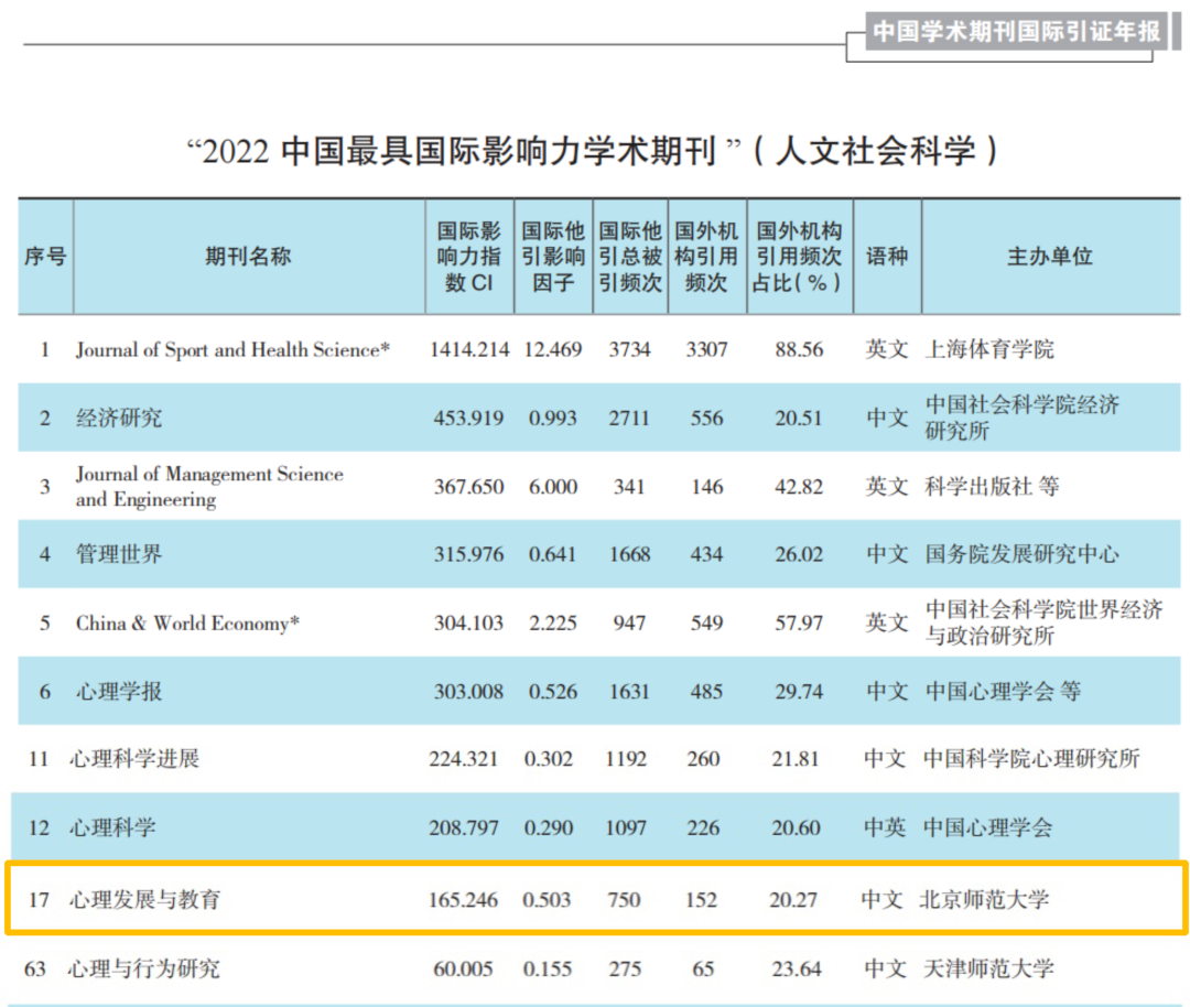 【喜报】《心理发展与教育》入选“2022中国最具国际影响力学术期刊”