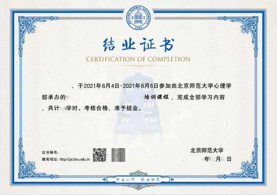 李非寒:博彩网站-体育博彩网站 教师,密苏里大学咨询心理学博士。博彩网站-体育博彩网站 应用心理专业硕士临床与咨询方向北京校区负责人,博彩网站-体育博彩网站 心理健康服务中心专职督导师,中国心理学会临床与咨询心理学注册督导师。 三、培训对象 满足以下任何条件之一可参加报名: 1.中国心理学会临床心理学注册心理师和助理心理师; 2.有3年以上咨询/治疗经验的心理学、教育学、临床医学、社会工作等相关专业的心理健康从业人员; 3.已经从事心理健康,心理辅导、咨询或治疗工作,且个体咨询小时数不少于50小时,具有专业咨询认证的心理咨询师或治疗师; 4.在读学生或学员。具体要求:有半年以上咨询或治疗经验的心理学、教育学、社会工作或相关专业的博士研究生,临床与咨询心理专业硕士研究生或临床与咨询心理专业能力长程培训项目在读学员等(长程培训项目不限制高校或公司承办,举办时间跨度1年或1年以上即可)。 四、培训时间 学习时间:2023年8月24日—2023年8月27日,共4天,32学时。 五、学习形式 线下学习。地址:博彩网站-体育博彩网站 EDP中心培训教室;北京市西城区新街口外大街8号金丰和创业园A座(北师大东门对面)。具体教室另行通知。 六、招生人数 招生人数:60人。 七、结业要求和结业证书 完成所有课程学习即可获得北京师范大学培训结业证书、中国心理学会注册系统继续教育项目证书;以下是北京师范大学培训结业证书样式:
