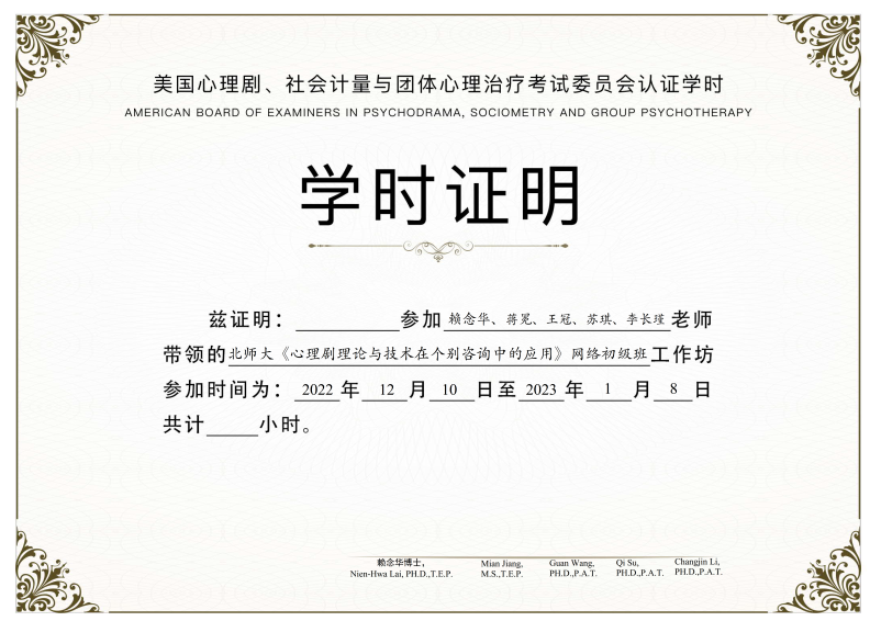 备注:修满学时、考核合格的学员,将获颁北京师范大学培训电子结业证书,可在北京师范大学培训管理信息平台(//jpc.bocaisports.net/cms/zscx/index.htm)进行证书查验。 2.美国心理剧考试委员会共计45小时(电子版、电子签名)