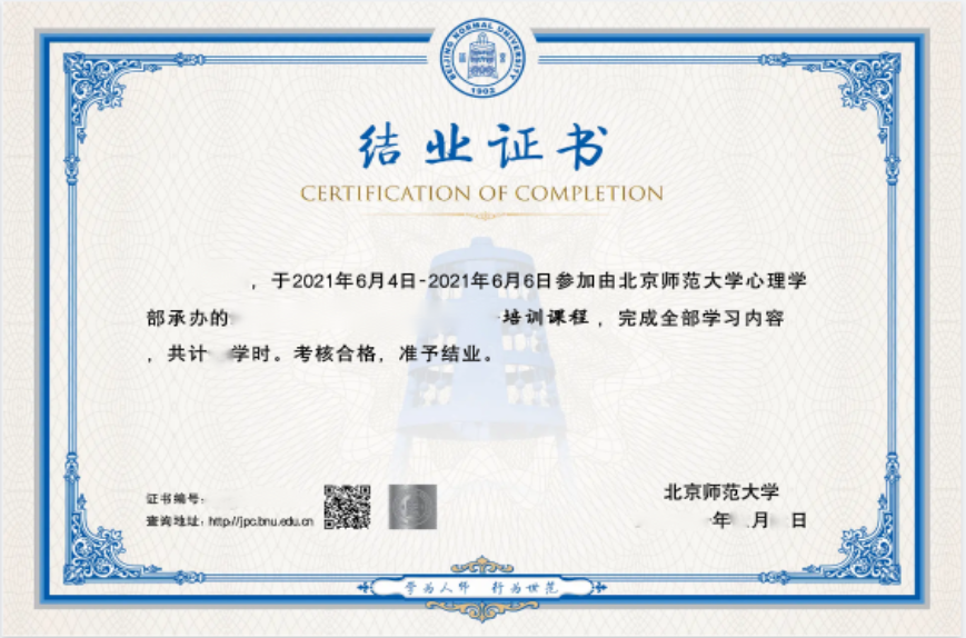 五、报名要求 名额有限,满足以下条件可以优先参加学习: 1.目前正在接个案的心理咨询师/治疗师/精神科医生; 2.高校、中小学的心理健康教师; 3.目前无危机状况(训练课程不做个人治疗); 4.需全程参加。 六、结业证书 完成所有课程学习即可获得以下证书: 1.北京师范大学培训电子结业证书(60学时)