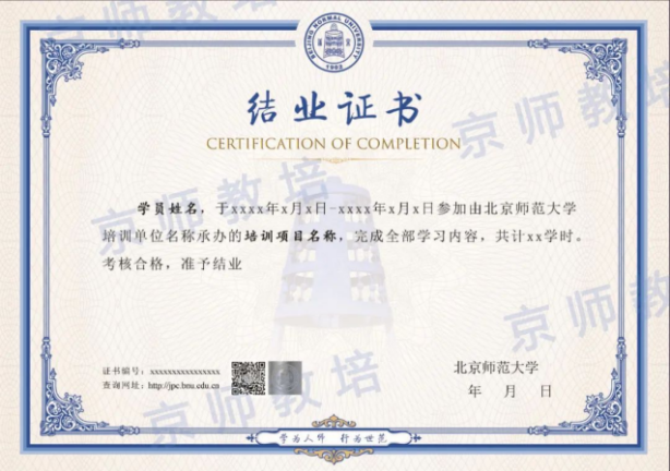 五、结业证书 为修满学时、考核合格的学员颁发北京师范大学培训结业证书,可在北京师范大学培训管理信息平台(//jpc.bocaisports.net/cms/zscx/index.htm)进行证书查验。