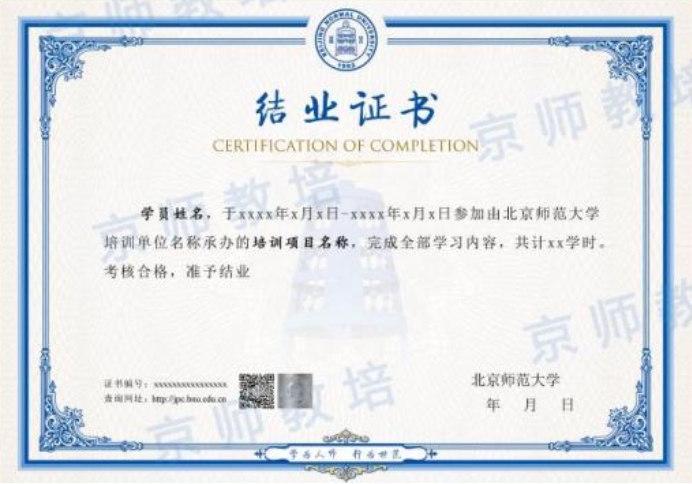 七、结业证书 1.完成所有课程学习即可获得北京师范大学培训结业证书。 备注:结业证书证书编号可以在北京师范大学培训与基础教育管理处官网查询以鉴别真伪。 2.完成所有课程学习可获得中国心理学会《注册系统认证继续教育项目》学分。 以下是北京师范大学培训结业证书样式: