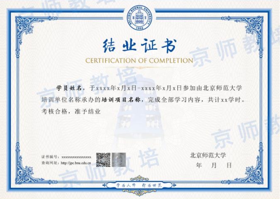 六、结业证书 为修满学时、考核合格的学员颁发北京师范大学首期叙事疗法连续培训初级班培训结业证书,可在北京师范大学培训管理信息平台(//jpc.bocaisports.net/cms/zscx/index.htm)进行证书查验。 备注:结业证书编号可在北京师范大学教育培训管理处的官网查询,以鉴别真伪。 证书样式如下:
